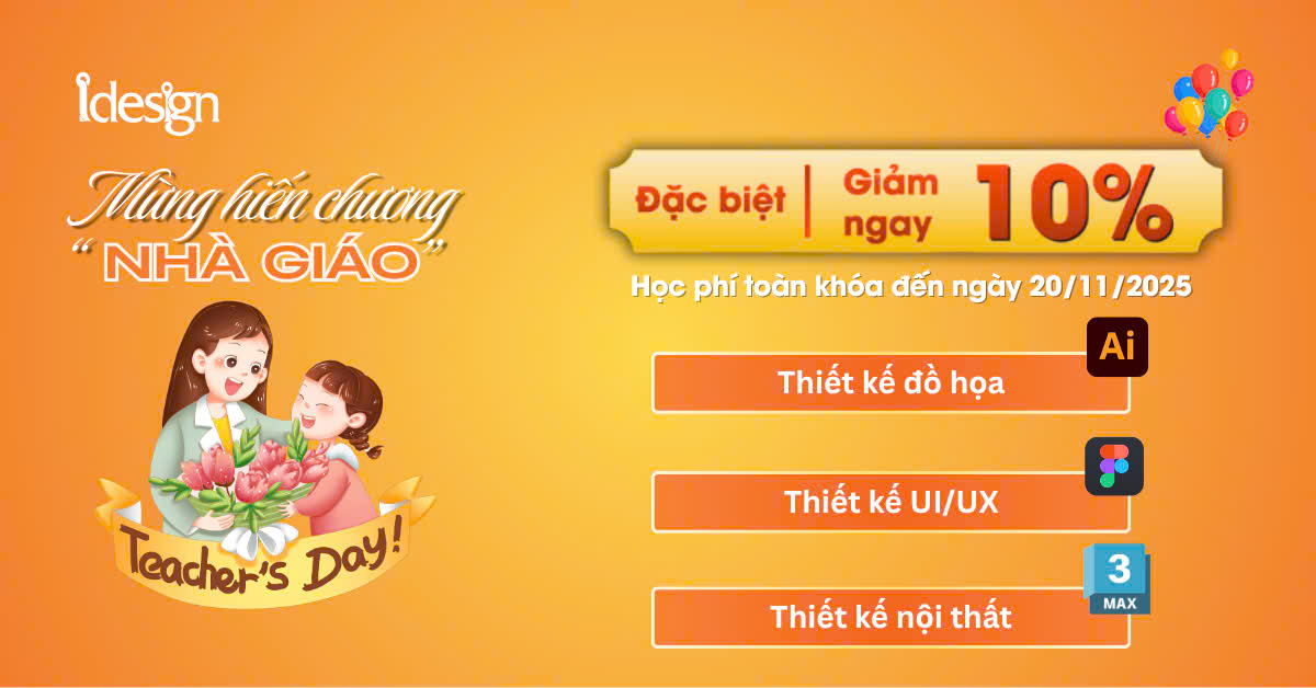 Nhân dịp Ngày Nhà Giáo Việt Nam 20/11, iDesign triển khai chương trình ưu đãi đặc biệt Giảm 10% học phí toàn khóa cho tất cả các khóa học thiết kế hấp dẫn nhất.